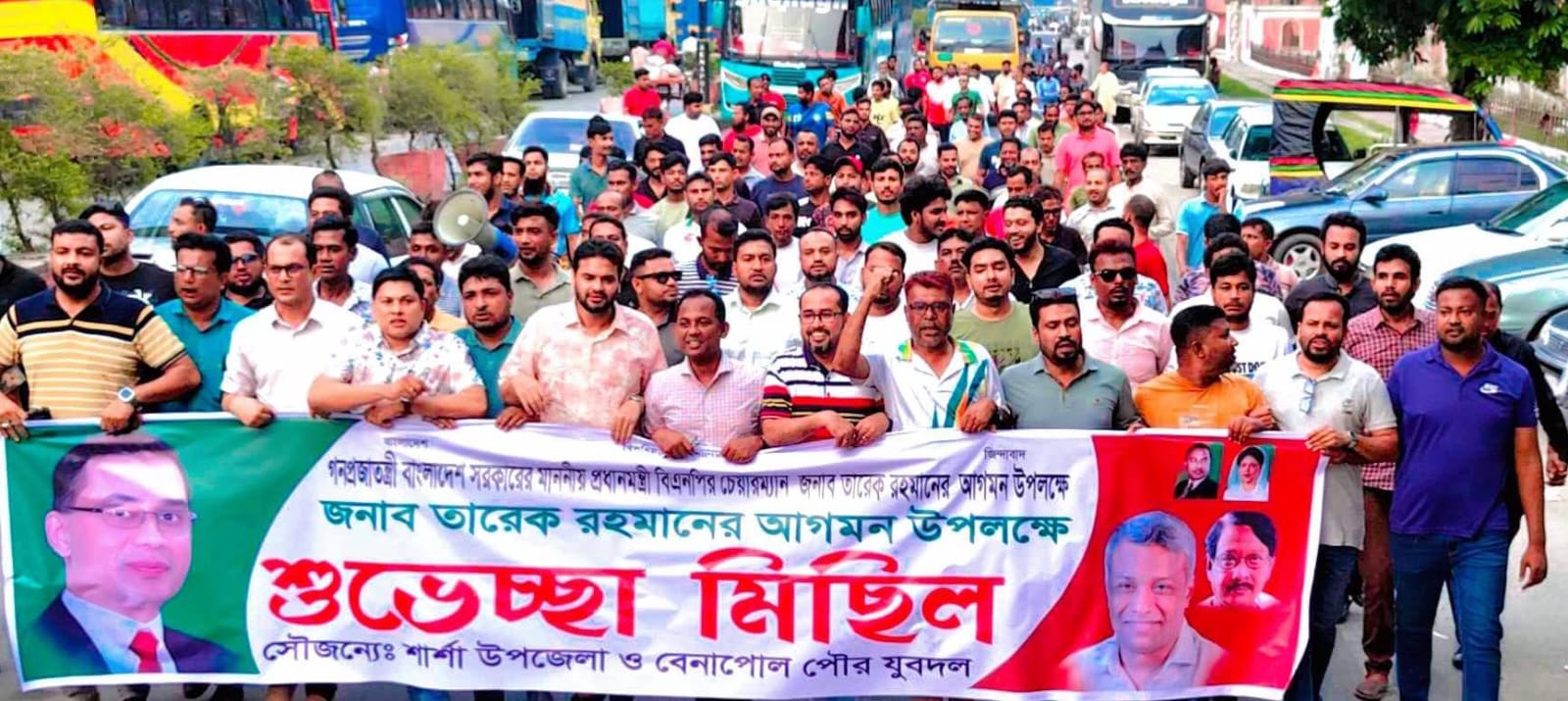 তারেক রহমানের আগমন ঘিরে বেনাপোলে যুবদলের শুভেচ্ছা মিছিল