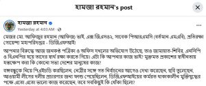 সেই আফিজের বিরুদ্ধে ‘জনকণ্ঠ দখলে’ ভূমিকা রাখার অভিযোগ ওঠায় ফেইসবুকে হতাশা প্রকাশ করেছেন হামজা রহমান নামের এক আওয়ামী লীগ কর্মী, যিনি সরকার পতনের পর লন্ডনে চলে গেছেন।
