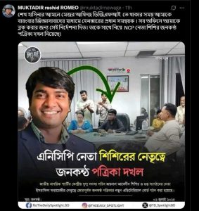 তিনি লিখেছেন, “শেখ হাসিনার আমলে মেজর আফিজ ডিজিএফআইতে থাকার সময় আমাকে বারংবার জিজ্ঞাসাবাদের মাধ্যমে হেনস্তার প্রধান সমন্বয়ক। সব অফিসে আমাকে ব্লক করার জন্য সেই নির্দেশনা দিত। তাকে সাথে নিয়ে NCP নেতা শিশির জনকন্ঠ পত্রিকা দখল নিয়েছে।”