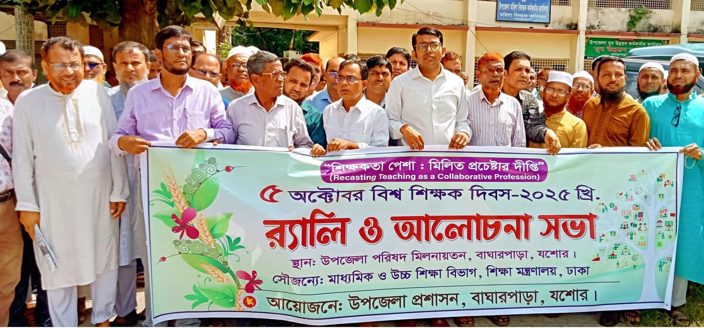 সাঈদ ইবনে হানিফ ঃ বাঘারপাড়া (যশোর): বাঘারপাড়া উপজেলা প্রশাসনের আয়োজনে বিশ্ব শিক্ষক দিবস পালিত হয়েছে। এ উপলক্ষে, সকালে উপজেলা পরিষদ মিলনায়তনে র্যালি পরবর্তী আলোচনা সভা অনুষ্ঠিত হয়।