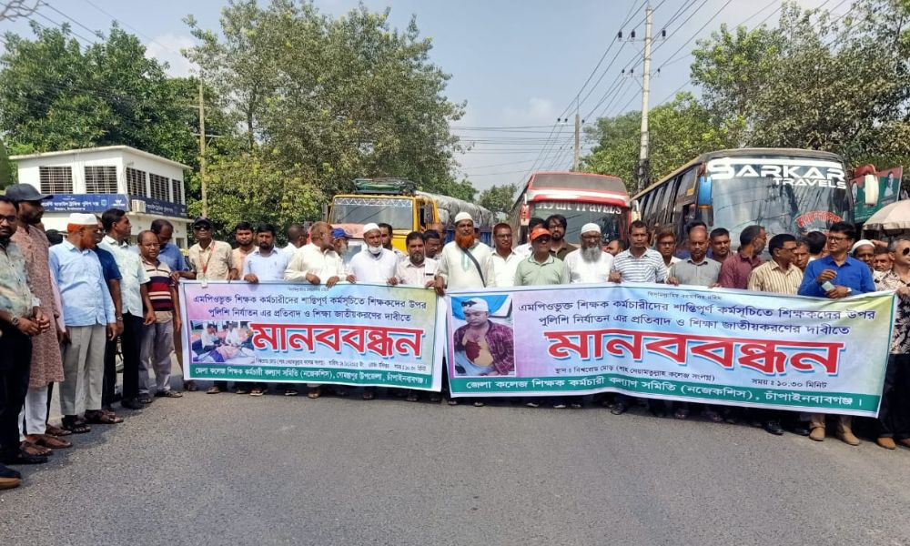 পুলিশি নির্যাতনের প্রতিবাদে ও তিন দফা দাবিতে এমপিওভুক্ত শিক্ষক-কর্মচারীদের চাঁপাইনবাবগঞ্জে মানববন্ধন
