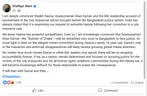 ইংরেজিতে লেখা স্ট্যাটাসে শফিকুল আলম লেখেন, ‘আমি দৃঢ়ভাবে বিশ্বাস করি, শেখ হাসিনা, আসাদুজ্জামান খান কামাল এবং জুলাইয়ের হত্যাকাণ্ডে জড়িত বলে অভিযুক্ত আওয়ামী লীগ নেতৃত্বকে শেষ পর্যন্ত বাংলাদেশের বিচারব্যবস্থার মুখোমুখি হতে হবে। ভারতের পক্ষ থেকেও ইতোমধ্যে জানানো হয়েছে যে, জুলাইয়ের হত্যাকাণ্ডের মামলায় দণ্ডিত হওয়ার পর হাসিনাকে প্রত্যর্পণের আমাদের অনুরোধ তারা পর্যালোচনা করছে।’