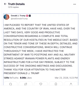 ট্রাম্প আরও বলেন, ‘কিন্তু এই গভীর, বিস্তারিত ও গঠনমূলক আলোচনার মেজাজ ও সুর বিবেচনা করে আমি প্রতিরক্ষা বিভাগকে আগামী পাঁচ দিনের জন্য ইরানের বিদ্যুৎকেন্দ্র এবং জ্বালানি অবকাঠামোতে সব ধরনের সামরিক হামলা স্থগিত রাখার নির্দেশ দিয়েছি। এই আলোচনা সপ্তাহজুড়ে চলবে। তবে এটি (হামলা না করার সিদ্ধান্ত) চলমান বৈঠক ও আলোচনার সাফল্যের ওপর নির্ভর করছে। এই বিষয়টির দিকে মনোযোগ দেওয়ার জন্য আপনাদের ধন্যবাদ!’