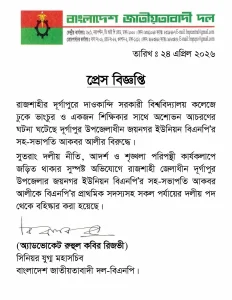 রাজশাহীর দুর্গাপুরের একটি কলেজের নারী প্রভাষককে মারধর করা বিএনপি নেতাকে দল থেকে বহিষ্কার করা হয়েছে।