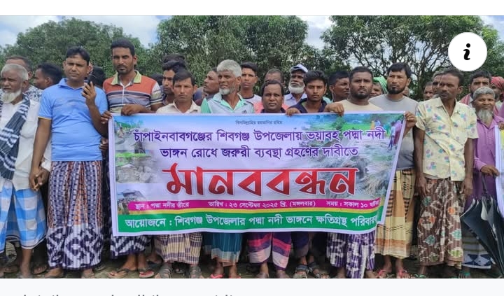 শিবগঞ্জে ভয়াবহ নদী ভাঙন রোধে জরুরী ব্যবস্থা গ্রহণের দাবীতে এলাকাবাসীর মানববন্ধন
