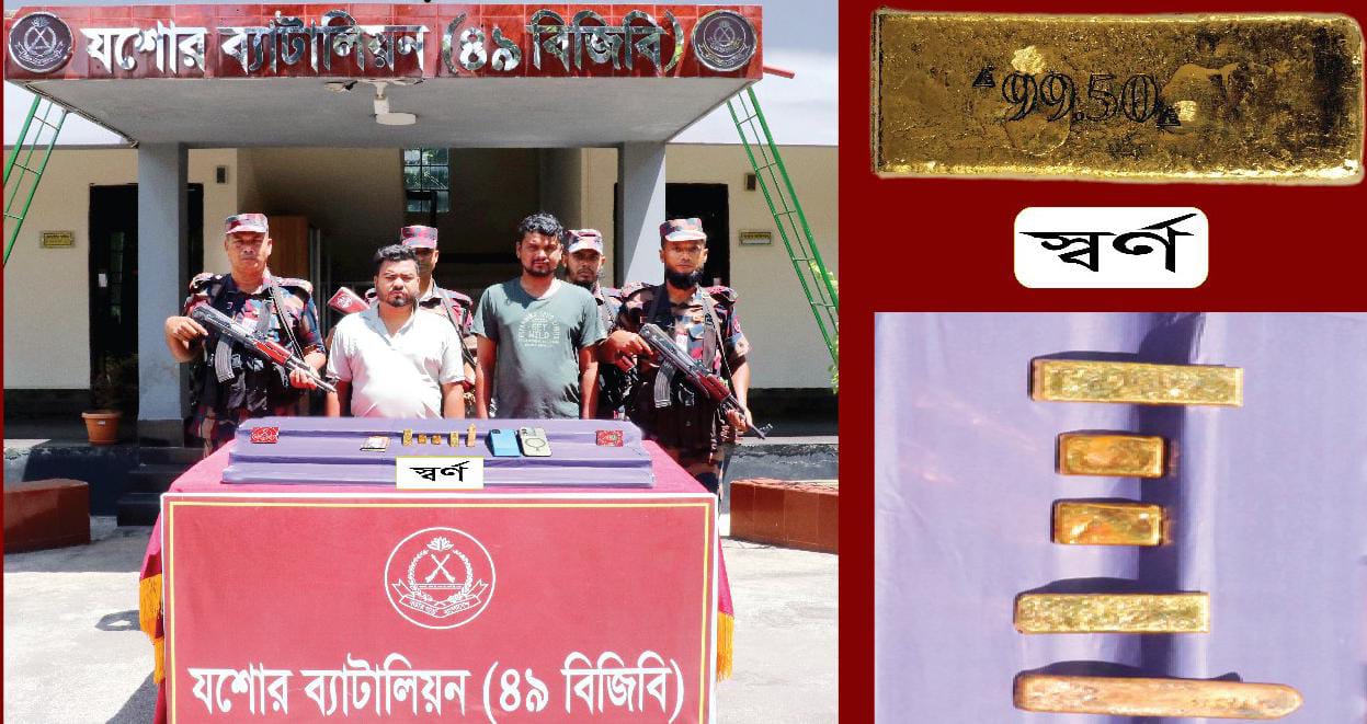 যশোরে বিজিবি’র অভিযানে ১ কোটি ২৩ লক্ষ টাকা দামের ৫ পিস স্বর্ণের বারসহ দুই পাচারকারী আটক
