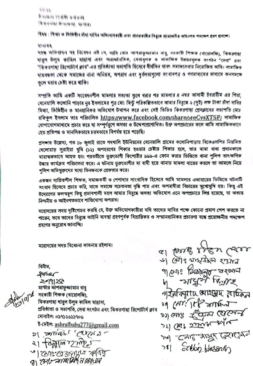 চাঁদা দাবির অপপ্রচার: ইউএনও বরাবর সাংবাদিকের লিখিত অভিযোগ, প্রশাসনের হস্তক্ষেপ কামনা