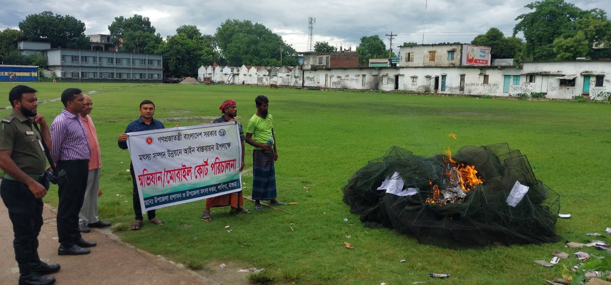 শালিখায় ফটকি নদী থেকে উদ্ধারকৃত ২৪টি অবৈধ চায়না দুয়ারী জালে আগুন